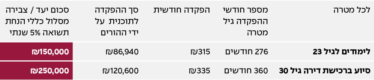 לקחנו סכום יעד של 150,000 ₪ חיסכון מצטבר לגיל 23 עבור הלימודים.